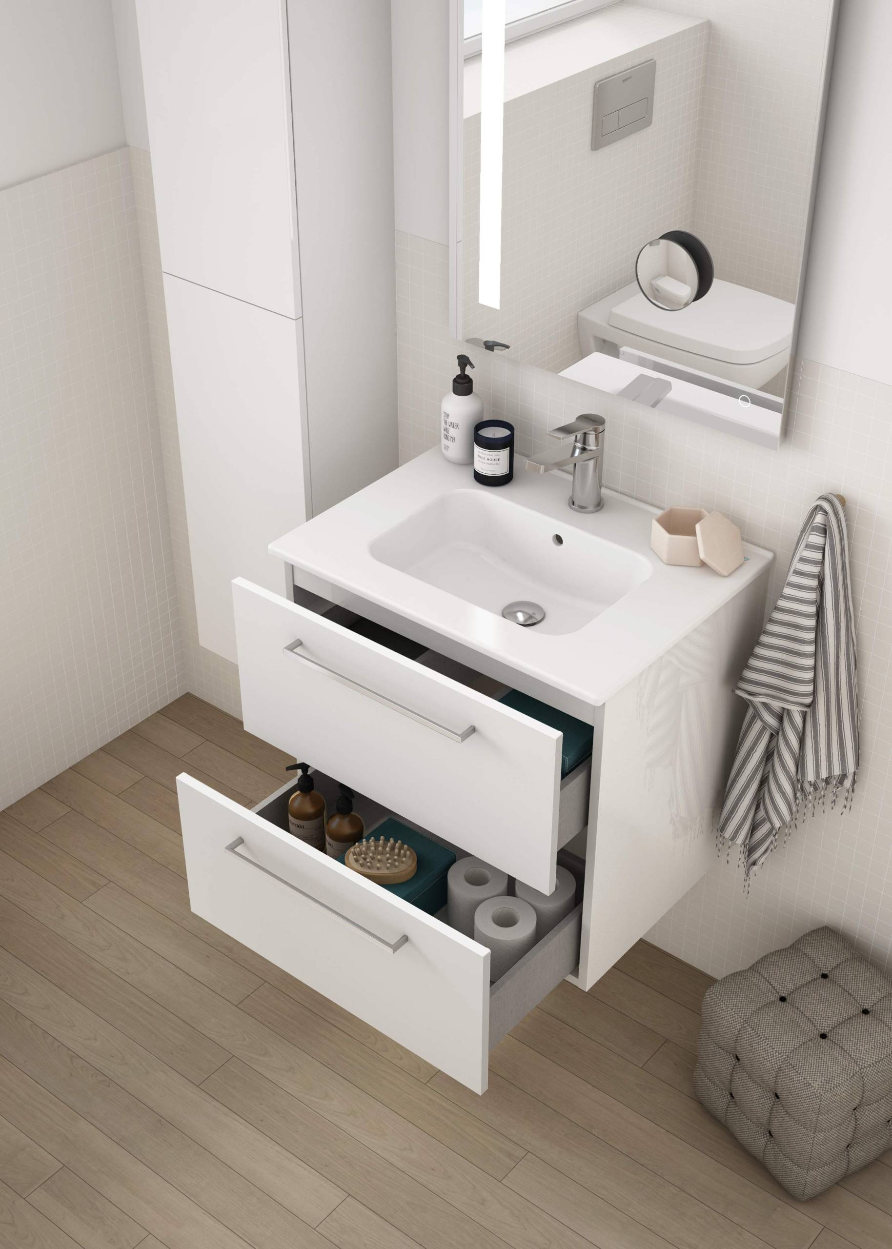 - Na embalagem: móvel, lavatório e kits de fixação.